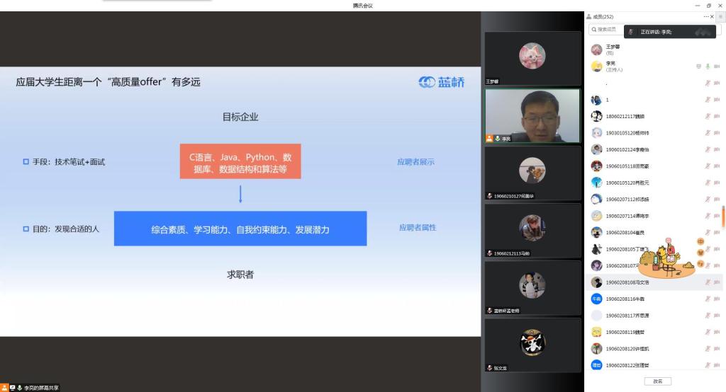 举办了面向毕业年级学生的大学生职业规划及就业需求形势分析专题讲座,本次讲座以线上形式开展,邀请了工业和信息化部人才交流中心、蓝桥杯大赛组委会副主任李亮主讲,讲座由辅导员王梦馨主持,学院毕业班辅导员孙君、于杰及毕业班200余名学生参加。