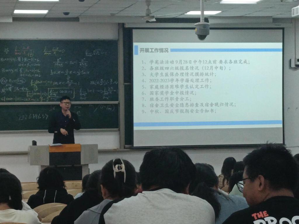 辅导员孙君首先就9月份开展的重点工作在会上进行通报。包括开展学宪法活动;四六级报名情况、大学生医保办理情况摸排统计;2022-2023学年学籍处理工作;家庭经济困难学生认定工作布置;班委工作职责分工;宿舍卫生安全隐患排查及宿舍晚归情况逐一进行公布。