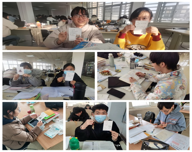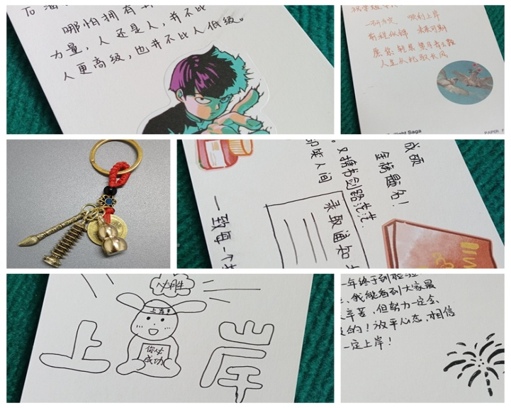 为祝福24届考研学生取得优异成绩,学院组织低年级同学为本次考研的学长手写了贺卡祝福语,明信卡上有着对学长成功考研最真挚的祝福,并且学院精心挑选了极具美好祝愿的挂件,由学院老师代表赠送给考研的学生代表转增忙碌考研的每位同学。