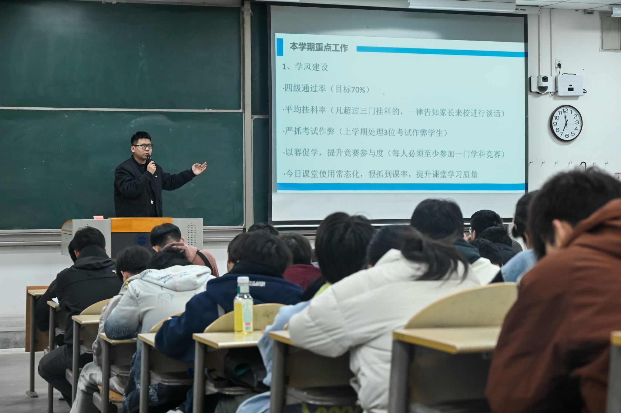 孙君首先回顾了上学期各专业学生学习的整体情况,用数据说话,通报了平均学分绩点、挂科门次、四级成绩等情况。接着,他在会上通报了了本学期着手开展的重点工作,要在预防电信诈骗、建立宿舍联络员制度大学生人际关系教育、课堂上课质量、考风考纪教育、竞赛促学等方面下功夫。随后,孙君提倡各班开展符合新时代高校大学生教育的主题活动,丰富学生们的课余生活,例如组织开展学习两会主题团日活动、职业生涯规划主题讲座、讲党史故事微党课比赛、学雷锋月主题教育观影等。