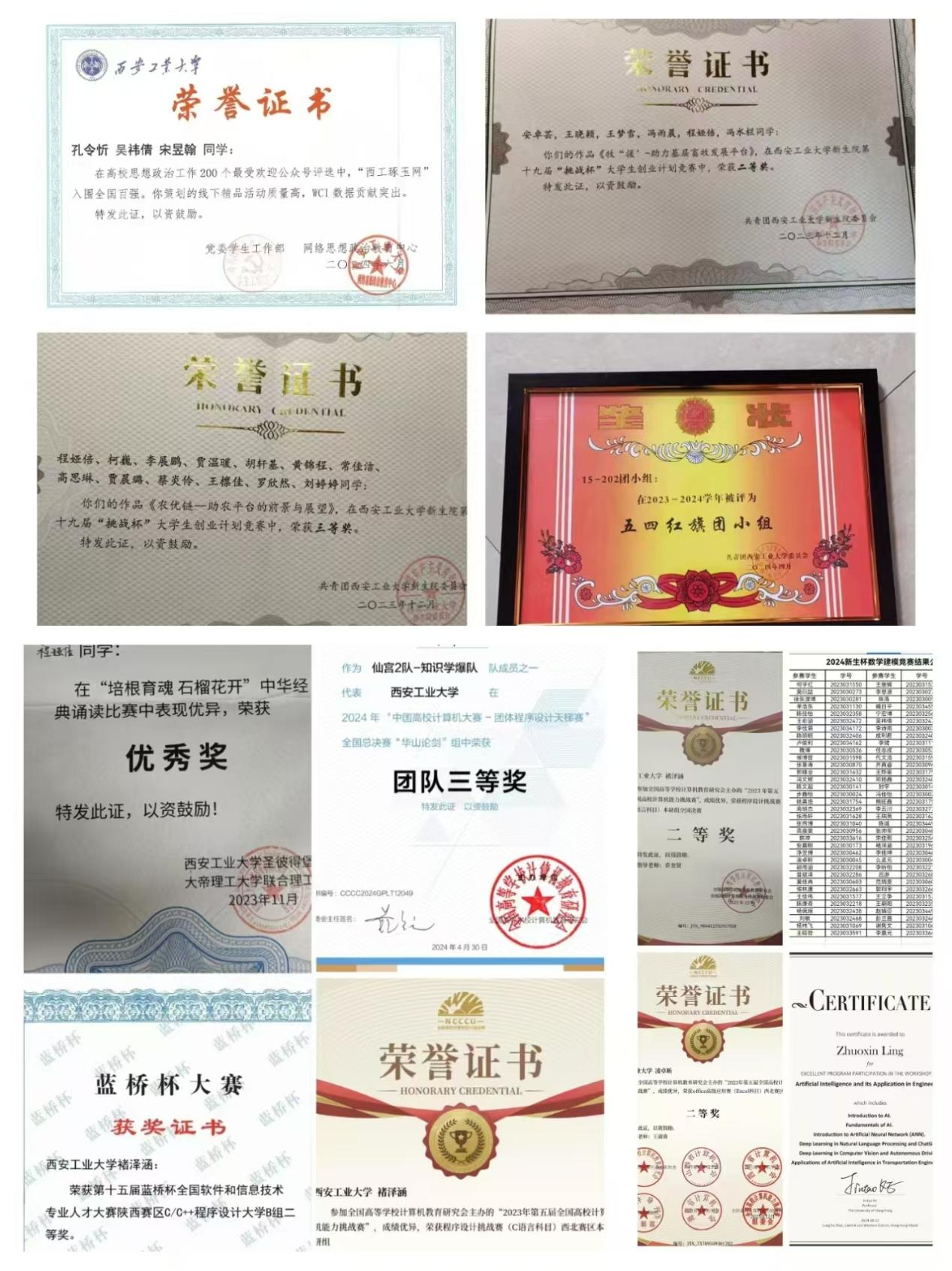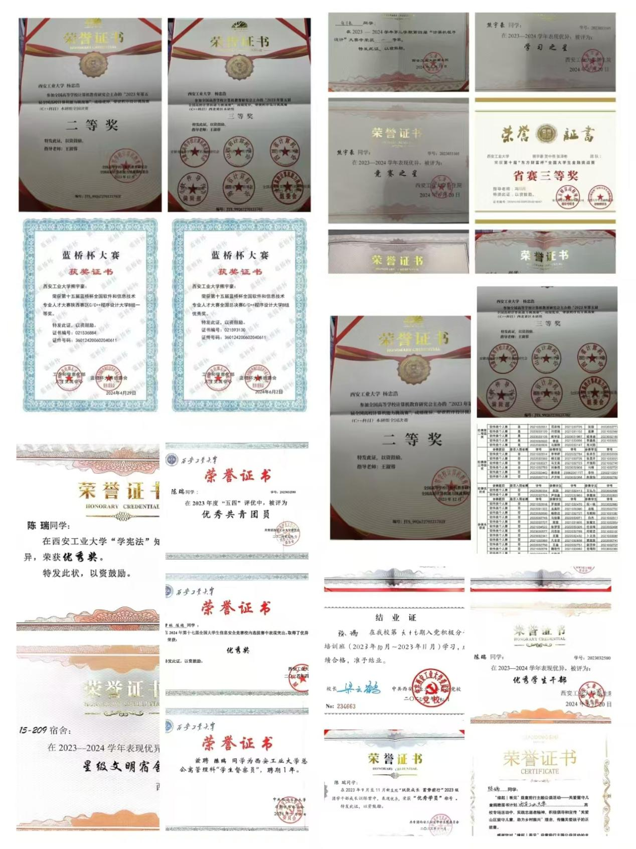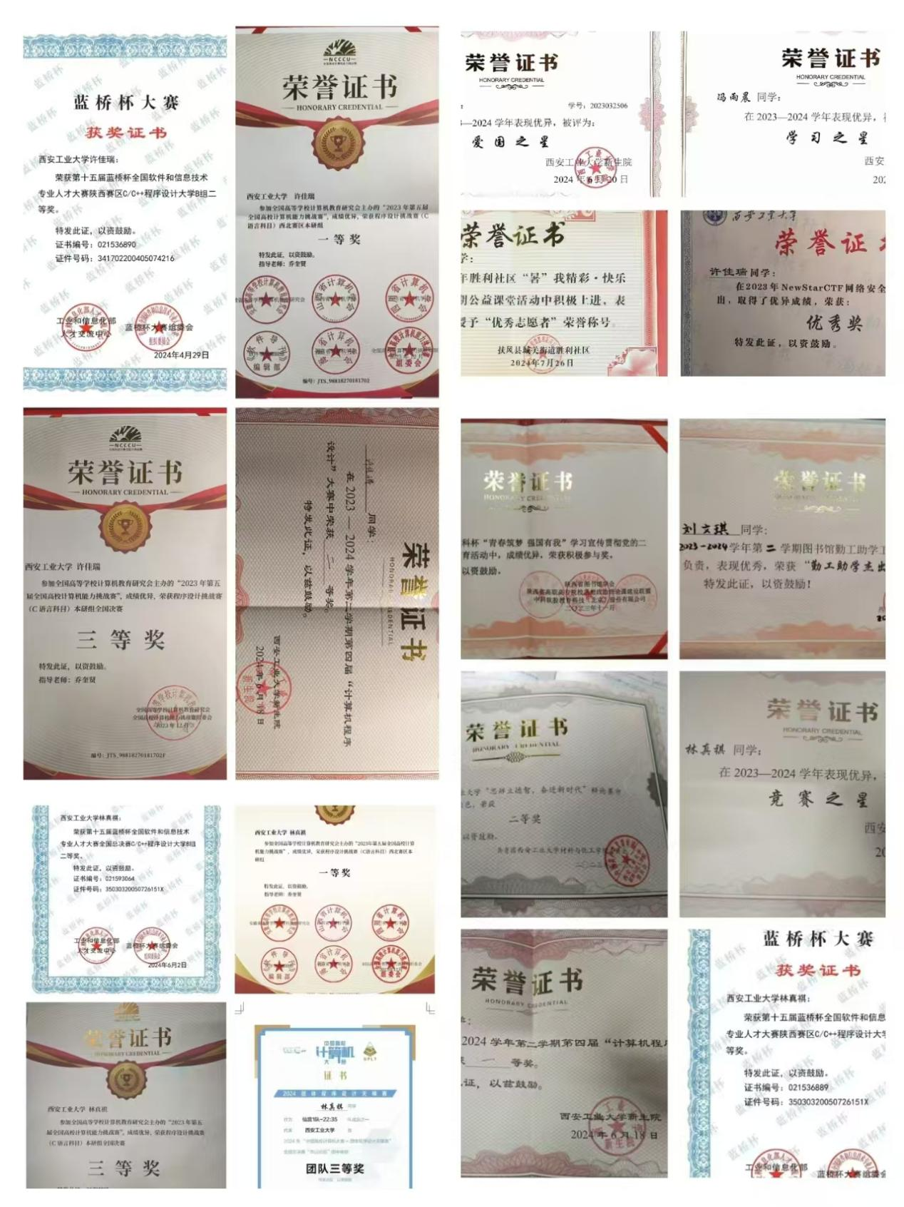 1,蓝桥杯省赛一等奖 2,蓝桥杯国赛优秀奖 3,全国高校计算机能力挑战赛国赛三等奖 4,全国高校计算机能力挑战赛省赛一等奖 5,全国大学生程序设计大赛全国一等奖 6,acm-icpc校赛三等奖 7,蓝桥杯校赛二等奖 8,新生院程序设计竞赛非计算机组一等奖 9,算法大赛新生组一等奖 10,算法大赛高年级组优秀奖 11,竞赛之星 12,学习之星 |