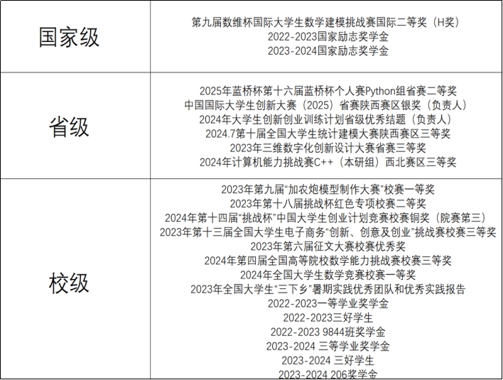 学科竞赛方面,她踊跃参与各类高水平赛事,斩获第九届数维杯国际大学生数学建模挑战赛国际二等奖,该赛事以实际应用问题为导向,极大地提升了李敏的建模分析与团队协作能力。她曾获中国国际大学生创新大赛陕西赛区银奖等省级奖项7 项、校级奖项二十余项,在竞赛中不断锤炼专业技能与创新思维。