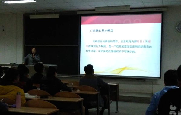 入党积极分子培训课在教2-209举行。此次党课由电信学院党委副书记姚老师主讲。同时,为凸显对此次党课的重视,学院14级导员王丹丹老师提前到场组织学生。