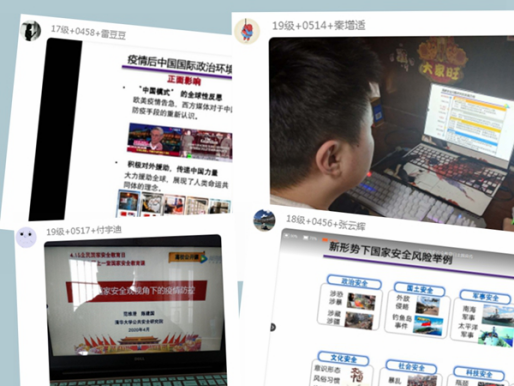 2019级王文静:“今年的国家安全教育日,注定是不平凡的一天,因为我们要同疫情作斗争,外防内输,内防扩散,是非常关键的一段时期,所以今天的课程意义重大。通过这次学习,使每个人更加明白安全的重要性,它不仅是对上级安全生产文件的学习过程,也是学生提高安全意识,自觉培养安全生产、自我保护意识,交流和总结安全工作经验的好途径。我们要认真学习,使安全会真正落到实处。”