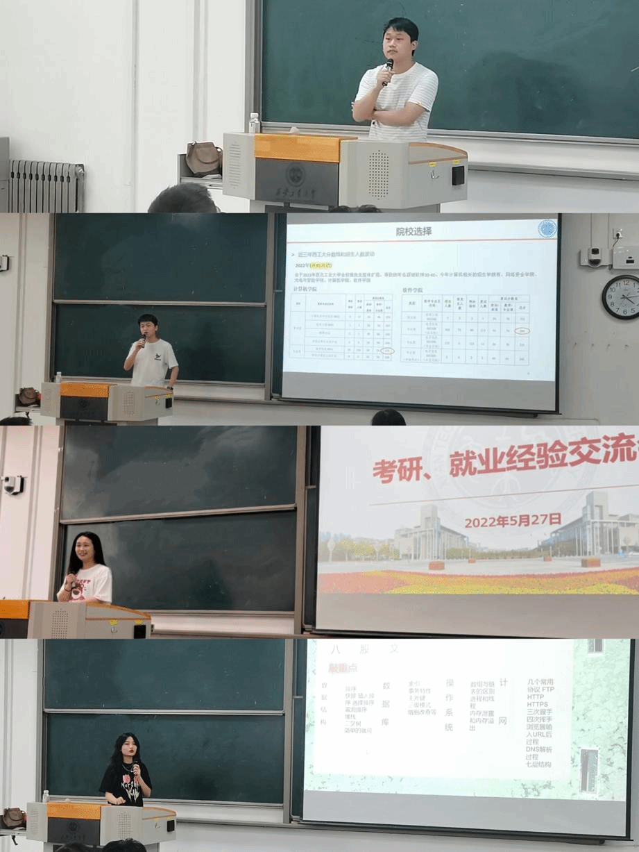 本次会议邀请了2018级毕业生优秀代表做经验分享报告,分别围绕考研成功经验和求职技巧两个主题展开讨论。毕业生吴金飞、李佳文分别考取了西北工业大学和长安大学,他们结合自己的成功经验,就考研形势、择校原则、复习计划和心态调整等方面进行深入分析,为计划考研的二年级学生厘清方向,也为三年级学生打了一剂强心针;毕业生屈颖、张彪作为就业学生中的优秀代表,详细探讨了求职准备注意事项、如何提升技术水平、秋招的重要性、简历的制作技巧、如何谈薪等学生热切关注的问题,并分别对二年级、三年级学生“当下应该做什么”、“怎么做”提出了切实可行的建议。