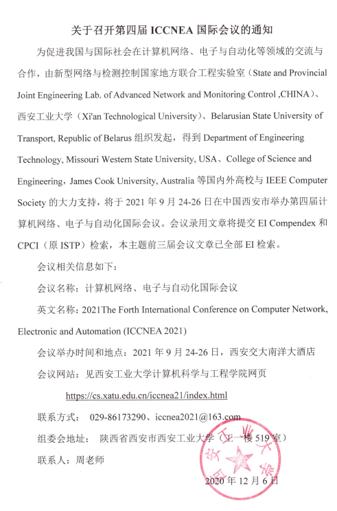 (Xi'an Technological University)、Belarusian State University of Transport, Republic of Belarus组织发起,得到Department of Engineering Technology, Missouri Western State University, USA、College of Science and Engineering,James Cook University, Australia等国内外高校与IEEE Computer Society的大力支持,将于2021年9月24-26日在中国西安市举办第四届计算机网络、电子与自动化国际会议。会议录用文章将提交EI Compendex和CPCI(原ISTP)检索,本主题前三届会议文章已全部EI检索。