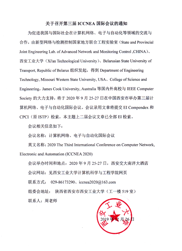 (Xi'an Technological University)、Belarusian State University of Transport, Republic of Belarus组织发起,得到Department of Engineering Technology, Missouri Western State University, USA、College of Science and Engineering,James Cook University, Australia等国内外高校与IEEE Computer Society的大力支持,将于2020年9月25-27日在中国西安市举办第三届计算机网络、电子与自动化国际会议。会议录用文章将提交EI Compendex和CPCI(原ISTP)检索,本主题上二届会议文章已全部EI检索。