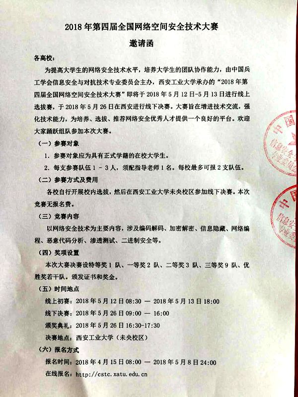 承办的“2018年第四届全国网络空间安全技术大赛”即将于2018年5月12日-5月13日进行线上选拔赛,于2018年5月26日在西安进行线下决赛。大赛旨在增进技术交流,强化技术能力,为培养、选拔、推荐网络安全优秀人才提供一个良好的平台。欢迎大家踊跃组队参加本次大赛。