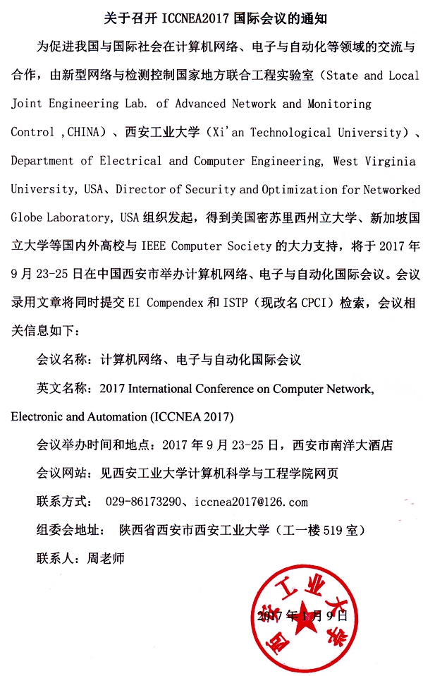 (Xi'an Technological University)、Department of Electrical and Computer Engineering, West Virginia University, USA、Director of Security and Optimization for Networked Globe Laboratory, USA组织发起,得到美国密苏里西州立大学、新加坡国立大学等国内外高校与IEEE Computer Society的大力支持,将于2017年9月23-25日在中国西安市举办计算机网络、电子与自动化国际会议。会议录用文章将同时提交EI Compendex和ISTP(现改名CPCI)检索,会议相关信息如下: