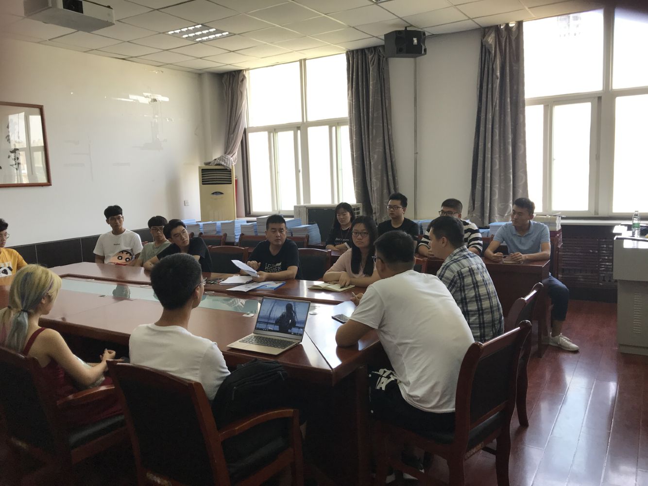 于工1- 306会议室召开了2019年迎新工作布置会。2019级新生辅导员解军强、王梦馨,团委书记于杰,辅导员韩霄、研究生秘书高金生及全体团学干部参加了此次会议。