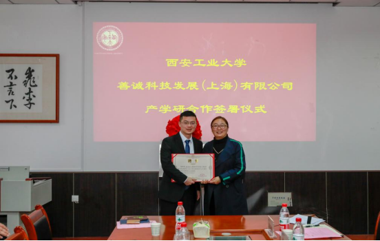共同签署了《校企产学研合作协议》。未来,双方将在联合人才培养、联合技术攻关与协同创新、就业与培训等多个方面开展战略合作。签约仪式后,副校长张群与善诚科技董事长小田寬互赠礼物,双方人员合影留念。