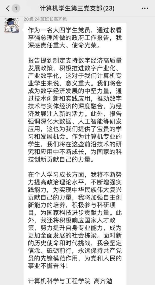 学生第三党支部开展了一次以学习2024《政府工作报告》为主题的交流活动。在这个活动中,每位党员都积极参与,分享了自己的学习心得,激荡着思想的火花。