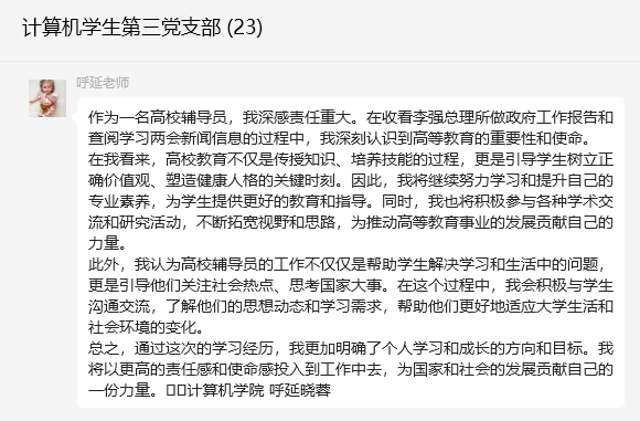 在交流环节中,每位党员都畅所欲言,分享了自己对两会精神的理解和感悟。支部书记呼延晓蓉同志提到,身为一名高校辅导员,自身工作不仅仅是帮助学生解决学习和生活中的问题,更是引导他们关注社会热点、思考国家大事。在这个过程中,积极与学生沟通交流,了解他们的思想动态和学习需求,帮助他们更好地适应大学生活和社会环境的变化。