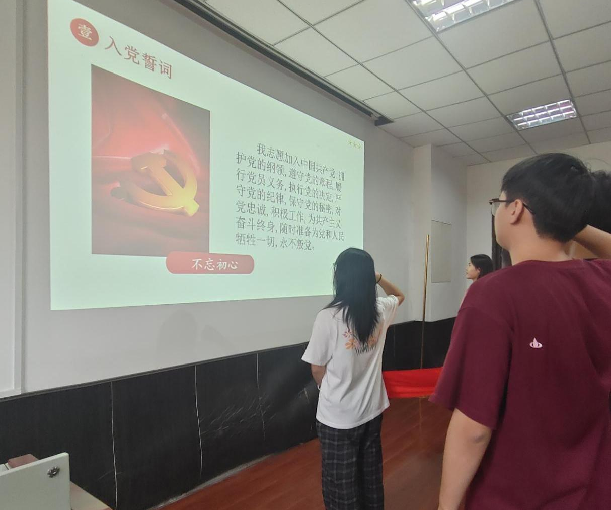 活动伊始,全体党员庄严肃立,面向国旗,同唱国歌。激昂的旋律在空气中回荡,点燃了每一位党员心中的爱国热情。随后,全体党员重温入党誓词。在庄严的氛围中,党员们高举右手,郑重宣誓。声声誓言,使全体党员坚定了初心使命。活动第三项,全体党员共同观看了阅兵式合集,深刻感受到了国家的繁荣富强,也更加坚定了作为新时代青年学子,要为实现中华民族伟大复兴的中国梦而努力奋斗的决心。